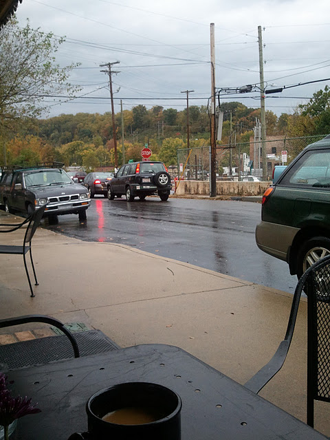 It’s a little past nine on a Tuesday morning. It’s raining here: a cool, light mist. I’m sitting outside, beneath a small overhang, at the little cafe a block from my apartment building with a cup of coffee and the computer I’m writing this on. Across the street a freight train just rolled by; behind it the trees are beginning to show their autumn colors.